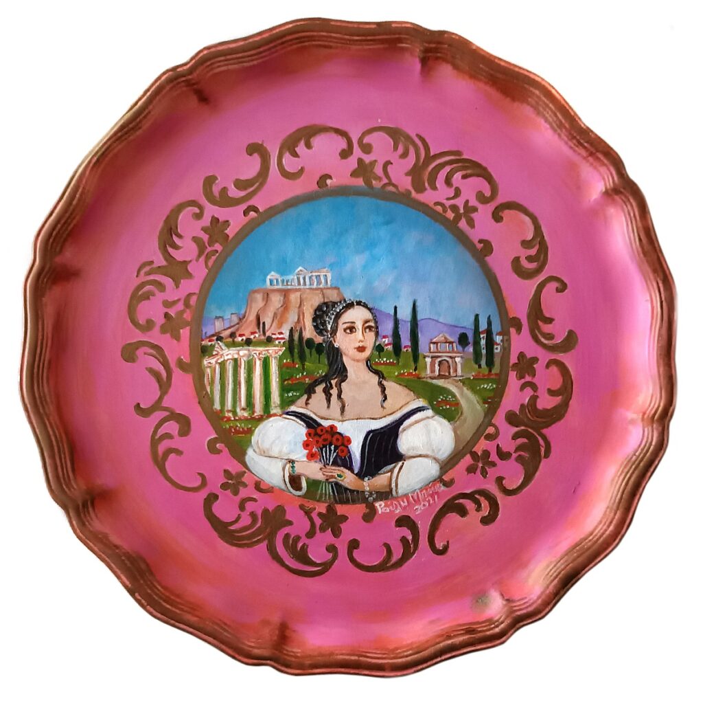 Η έκθεση «Ωραίες των Δίσκων» αναβιώνει πρόσωπα και τοπία της ελληνικής ιστορίας, από τους ήρωες της Επανάστασης μέχρι τις προσωπικότητες της Μικρασιατικής Καταστροφής. Η δημιουργός ζωγραφίζοντας σε παλιούς μεταλλικούς δίσκους σερβιρίσματος, φιλοτεχνεί μια συναρπαστική συλλογή που φωτίζει τις ιστορικές και πολιτιστικές σχέσεις μεταξύ Ανατολής και Δύσης.