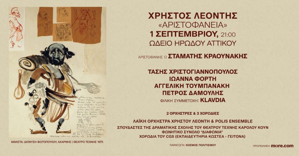Ο Χρήστος Λεοντής σας καλεί τη Δευτέρα 1η Σεπτεμβρίου στο Ηρώδειο για να υποδεχτούμε όλοι μαζί, τον παλιό και πολυαγαπημένο φίλο του Αριστοφάνη, για να συμμετέχει στο μεγάλο λαϊκό πανηγύρι που θα παρουσιάσει και θα διευθύνει ο συνθέτης με τίτλο «Αριστοφάνεια».
